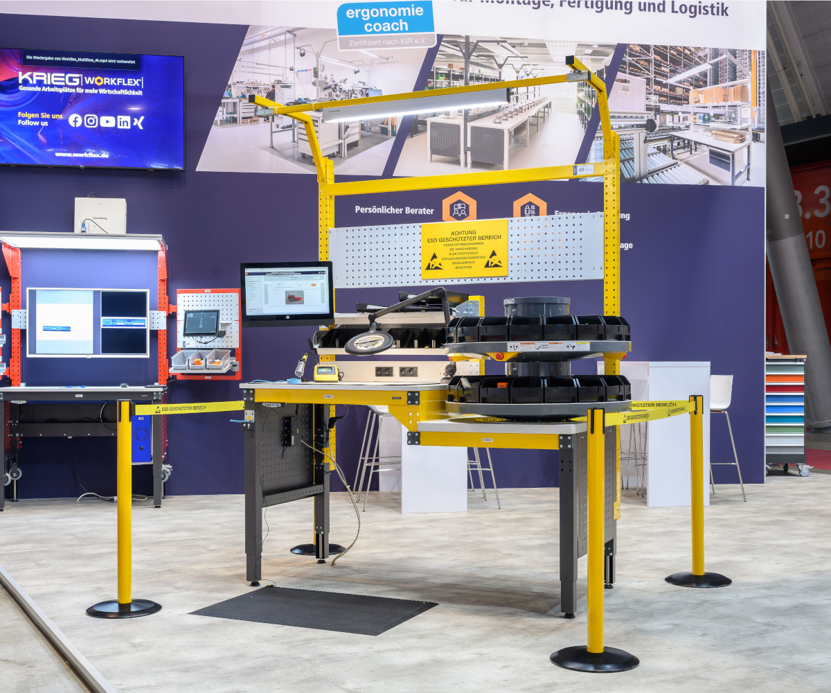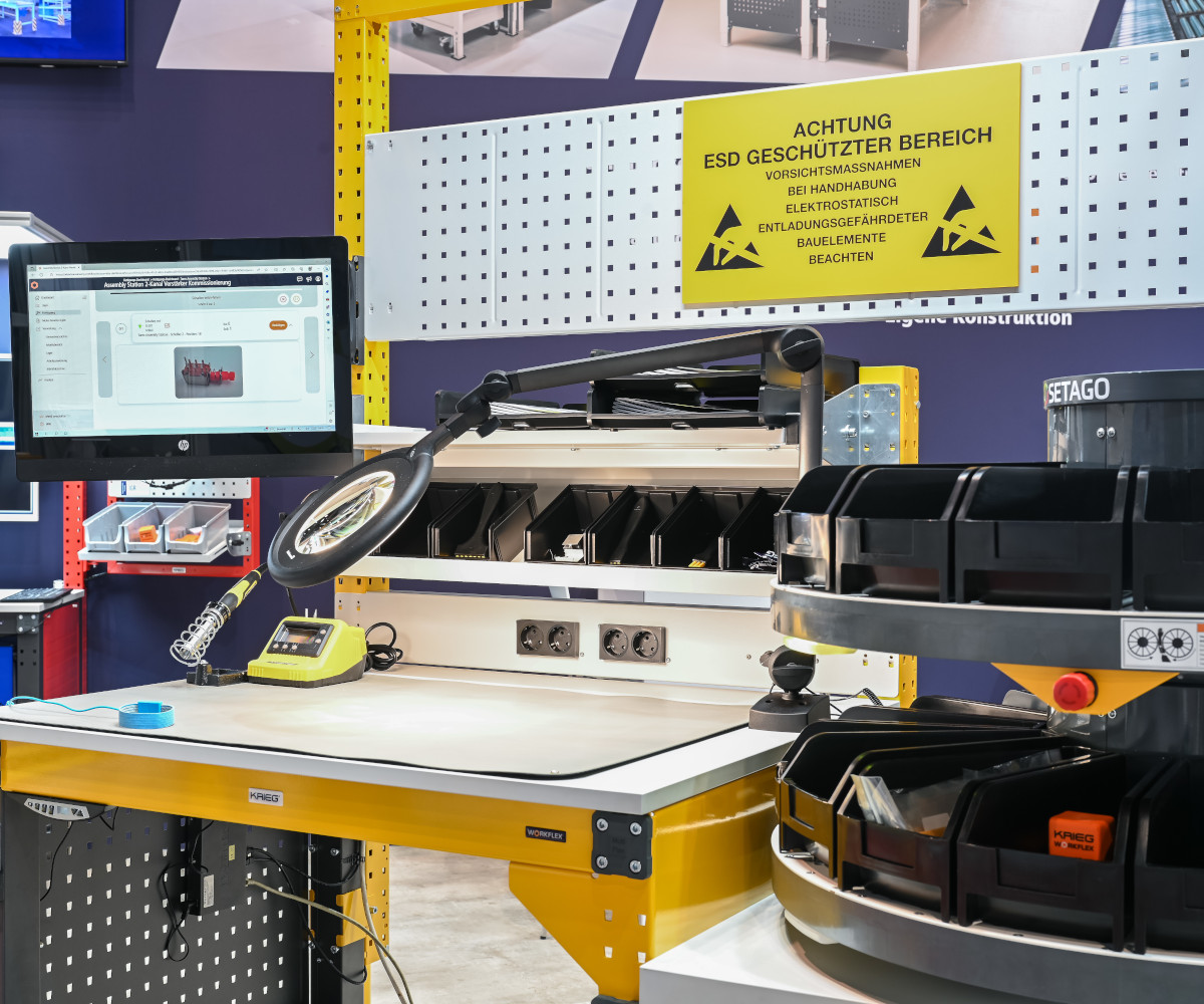 Der ESD-Arbeitsplatz MULTIPLAN sorgt für mehr Sicherheit beim Verarbeiten von elektrostatisch sensiblen Bauteilen. In Verbindung mit der Assembly Station, einer automatisierten Werkerführung, wird eine schnellere Erreichbarkeit der Materialien unterstützt und die Fehlerquote minimiert. Außerdem wird durch eine Gewichtskontrolle eine Echtzeit-Bestandserfassung ermöglicht.