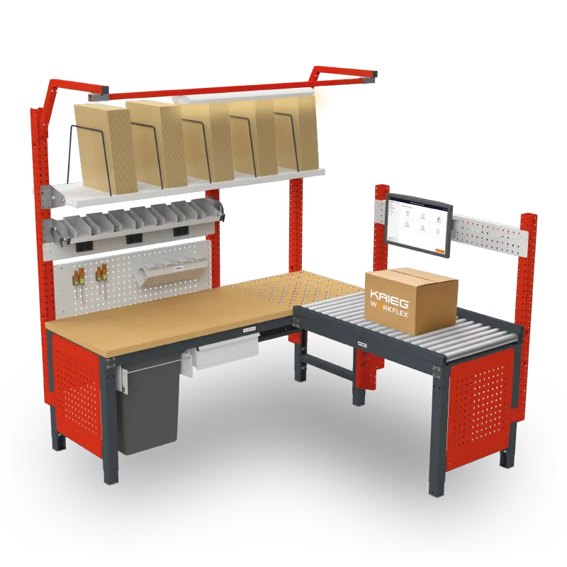 Der Verpackungsarbeitsplatz MULTIPLAN verbessert die Ergonomie beim Verpacken und sorgt für eine effiziente Arbeitsweise. Die Eck-Kombination ermöglicht eine optimale Nutzung des verfügbaren Platzes, indem alle Arbeitsmittel ergonomisch angeordnet sind. Höhenunterschiede zwischen verschiedenen Kartonformaten oder zum Förderband können schnell zu ungesunden Körperhaltungen führen. Ein optional integrierbarer Prozesslift gleicht diese Unterschiede durch eine elektrische Höhenverstellung aus und ermöglicht so ein ergonomisches und effizientes Arbeiten.
